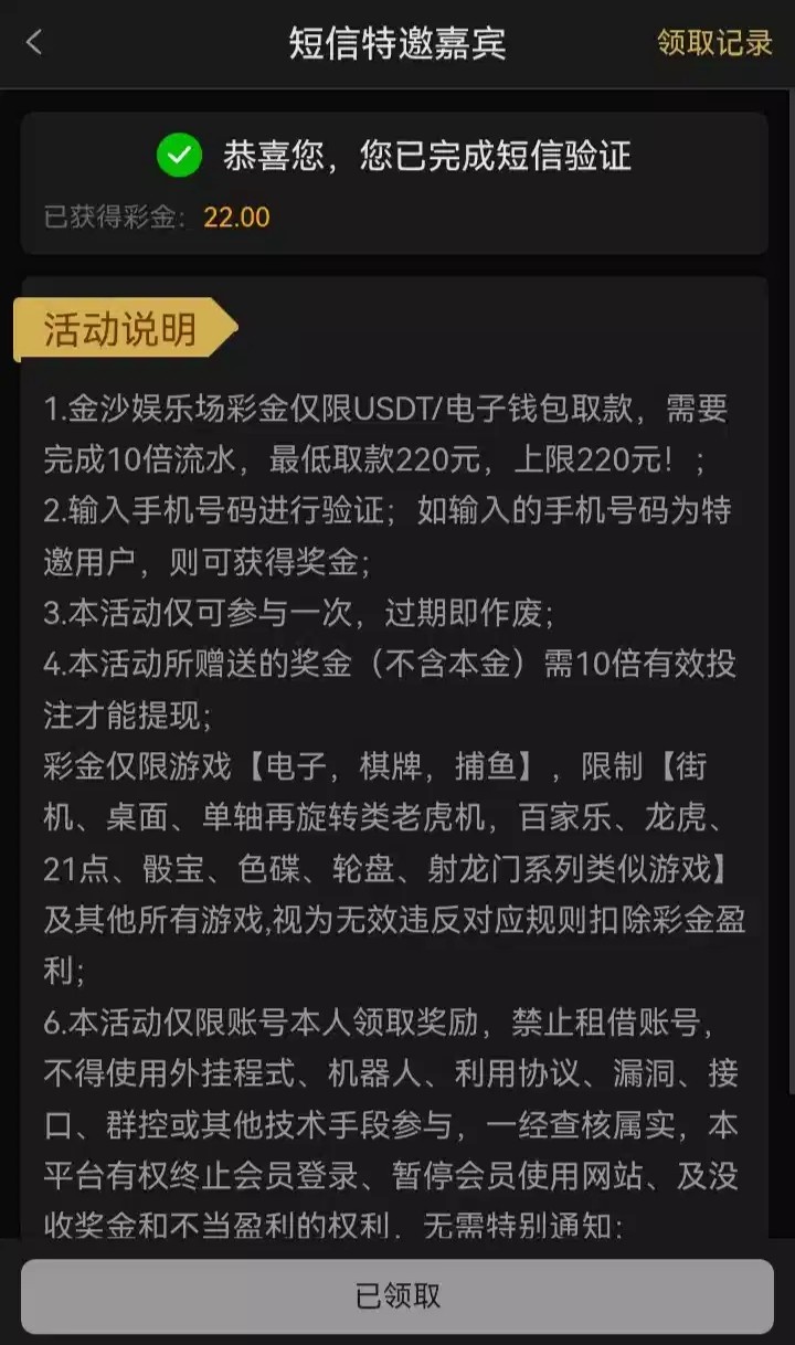 之前就有发过这个帖子还没有碰瓷过的哥们可以去试一下,注册好在优惠里点综合找到短信特邀在领取获取验证码领取,10倍流水,高低取款220,仅限电子/棋牌/捕鱼