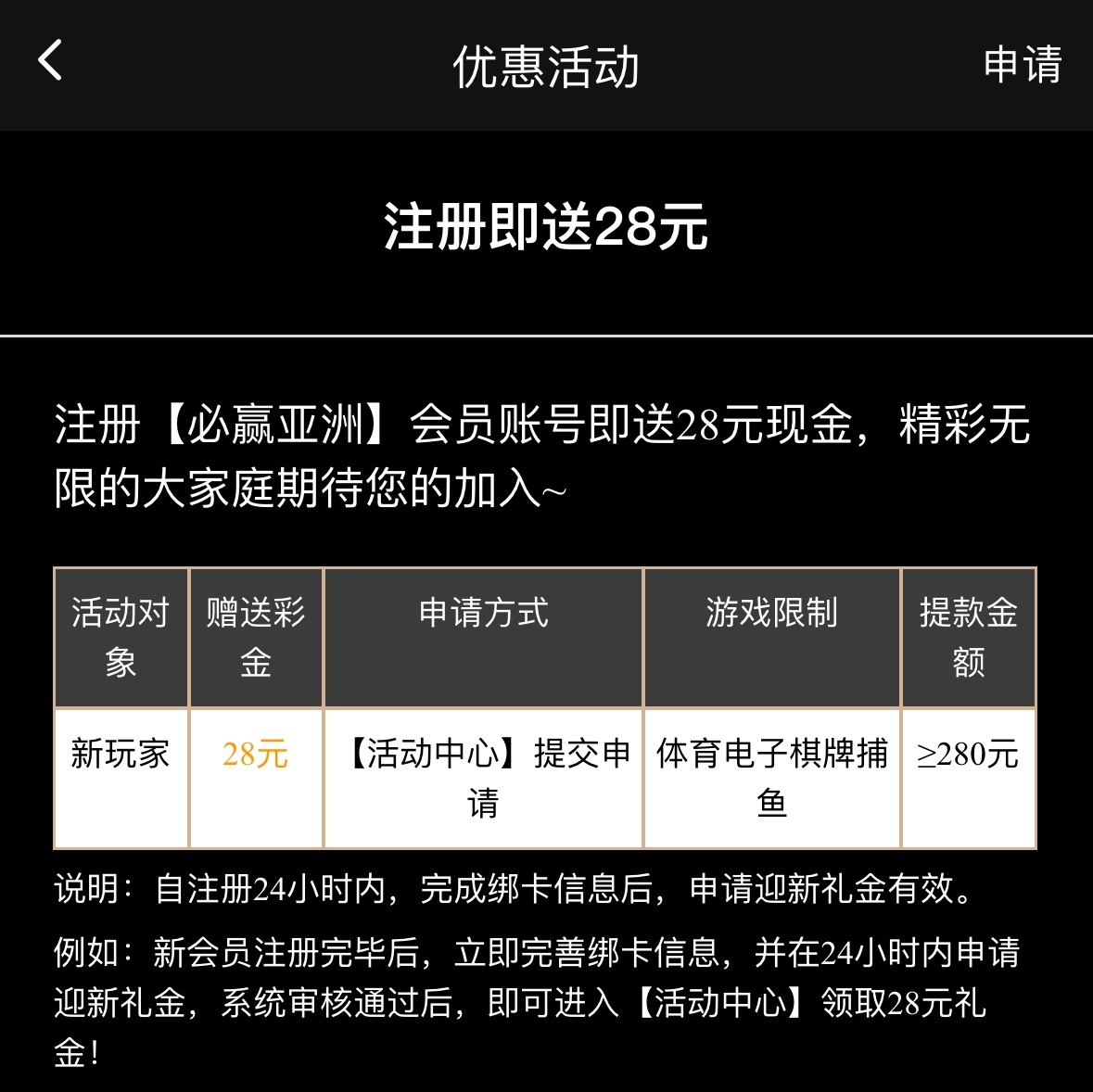 注册完善信息优惠里申请彩金,限体育电子捕鱼棋牌,提款280