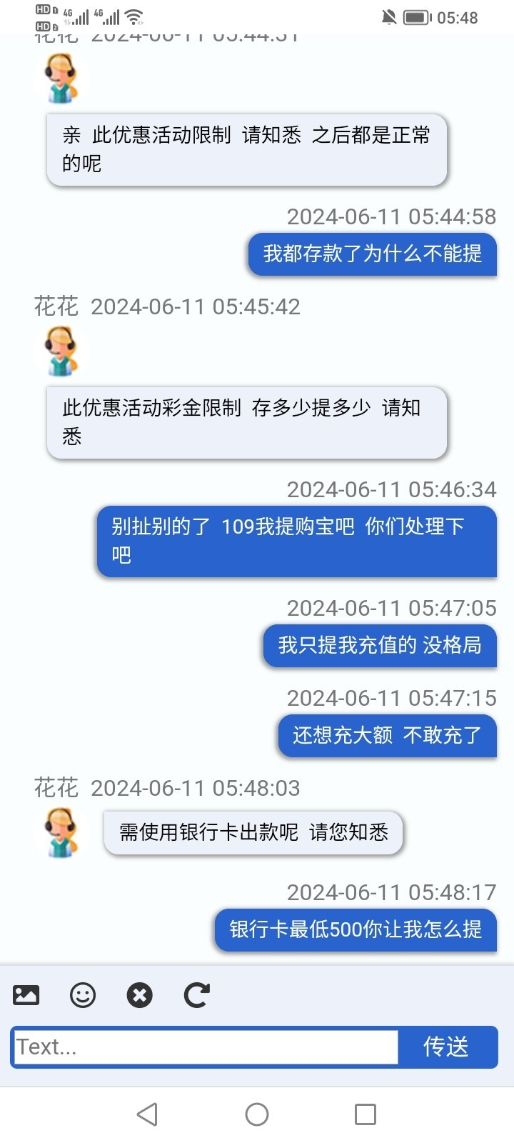 打电话送18 提款109 不让提 说让充109才能提 充值以后还是不让提 又让提供手持身份证 提供了也不让提又说只能提银行卡 银行卡最低500提 打到500也不让提 说我存款109只能提109 畜牲 合着我只能输一分不能赢